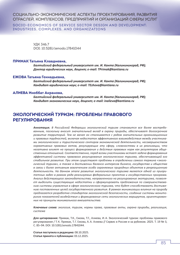 В Российской Федерации экологический туризм становится все более востребованным, поскольку вносит значительный вклад в охрану природы, обеспечивает долгосрочное развитие территорий. Тем не менее он сталкивается с рядом значительных организационных и правовых трудностей, включая недостаток эффективного взаимодействия между участниками экологического и туристического секторов экономической деятельности, несовершенством нормативных правовых актов, регулирующих эту сферу, сложностями в их реализации, что негативно влияет на процесс формирования и действия правовых норм как регуляторов общественных отношений. Соответственно, перед всеми участниками встает задача формирования эффективной системы правового регулирования экологического туризма, обеспечивающей его стабильное развитие. При этом существуют проблемы в определении самого термина «экологический туризм», а также в достижении баланса интересов бизнеса, государства и общества в связи с более активным вовлечением особо охраняемых природных объектов в рекреационную деятельность. На данном этапе развитие экологического туризма является одной из приоритетных задач в рамках ряда реализуемых федеральных проектов и государственных программ. Анализ действующего законодательства, направленного на регулирование экотуризма, позволяет выделить существующие недостатки и сформулировать предложения по совершенствованию системы управления в сфере экологического туризма, что будет способствовать достижению поставленных целей государственного развития. В рамках минимизации влияния на природу предлагается разработка стандартов экологической безопасности, создание системы мониторинга показателей воздействия и формирование сети экологических маршрутов, ориентированных на принципы минимального вмешательства.