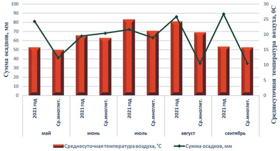 Погодные условия Р. Крым в 2021 году в целом были близки к уровню средних многолетних данных. Летние месяцы были достаточно влажными и умеренно жаркими: температурный режим июня превышал норму в среднем на 0,8–1,5°С, при достаточном количестве влаги, что способствовало хорошей приживаемости рассады перца после высадки в открытый грунт. Среднесуточные температуры воздуха в июле соответствовали значениям от 23,0 до 27,1°С, при норме 20,5…21,6°С. Однако во время массового цветения перца максимальная температура воздуха поднималась выше 36°С, что привело к низкой завязываемости плодов. В течении всех летних месяцев, с мая по сентябрь, количество осадков было в 2 раза выше нормы, в целом за вегетацию выпало 558,4 мм против нормы 276 мм (рис. 1).