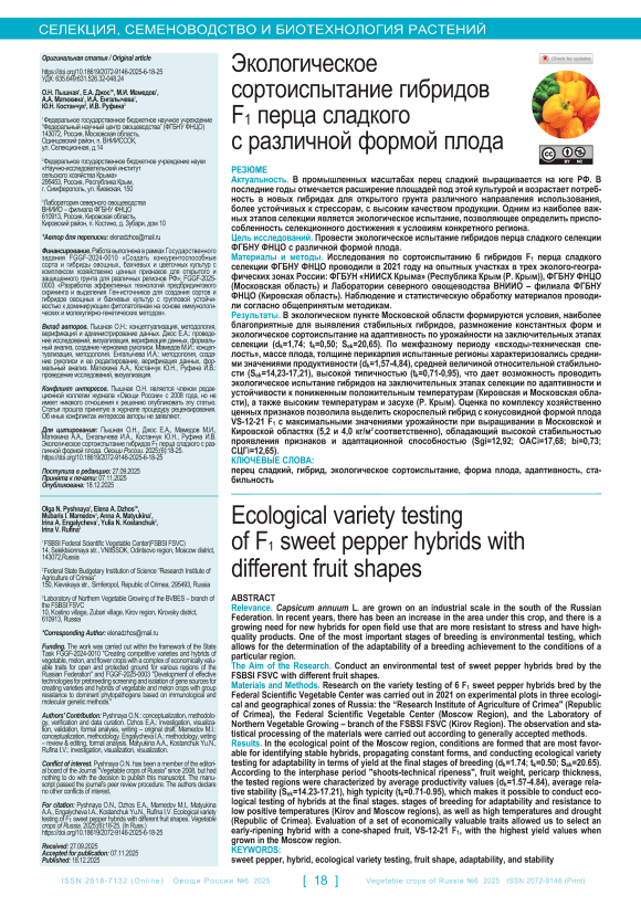 Актуальность. В промышленных масштабах перец сладкий выращивается на юге РФ. В последние годы отмечается расширение площадей под этой культурой и возрастает потребность в новых гибридах для открытого грунта различного направления использования, более устойчивых к стрессорам, с высоким качеством продукции. Одним из наиболее важных этапов селекции является экологическое испытание, позволяющее определить приспособленность селекционного достижения к условиям конкретного региона. Цель исследований. Провести экологическое испытание гибридов перца сладкого селекции ФГБНУ ФНЦО с различной формой плода. Материалы и методы. Исследования по сортоиспытанию 6 гибридов F1 перца сладкого селекции ФГБНУ ФНЦО проводили в 2021 году на опытных участках в трех эколого-географических зонах России: ФГБУН «НИИСХ Крыма» (Республика Крым (Р. Крым)), ФГБНУ ФНЦО (Московская область) и Лаборатории северного овощеводства ВНИИО – филиала ФГБНУ ФНЦО (Кировская область). Наблюдение и статистическую обработку материалов проводили согласно общепринятым методикам. Результаты. В экологическом пункте Московской области формируются условия, наиболее благоприятные для выявления стабильных гибридов, размножение константных форм и экологическое сортоиспытание на адаптивность по урожайности на заключительных этапах селекции (dk = 1,74; tk = 0,50; Sek = 20,65). По межфазному периоду «всходы-техническая спелость», массе плода, толщине перикарпия испытанные регионы характеризовались средними значениями продуктивности (dk = 1,57-4,84), средней величиной относительной стабильности (Sek = 14,23-17,21), высокой типичностью (tk = 0,71-0,95), что дает возможность проводить экологическое испытание гибридов на заключительных этапах селекции по адаптивности и устойчивости к пониженным положительным температурам (Кировская и Московская области), а также высоким температурам и засухе (Р. Крым). Оценка по комплексу хозяйственно ценных признаков позволила выделить скороспелый гибрид с конусовидной формой плода VS-12-21 F1 с максимальными значениями урожайности при выращивании в Московской и Кировской областях (5,2 и 4,0 кг/м2 соответственно), обладающий высокой стабильностью проявления признаков и адаптационной способностью (Sgi = 12,92; OACi = 17,68; bi = 0,73; СЦГi = 12,65).