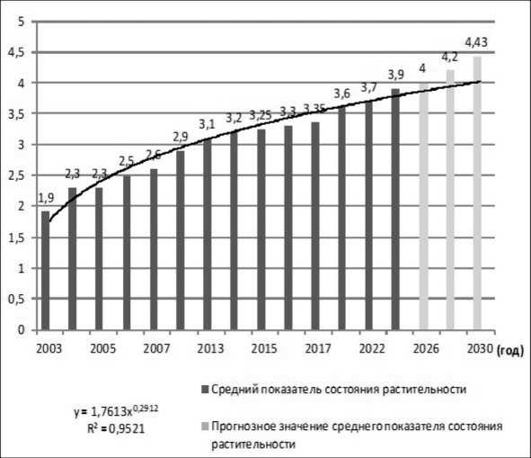 В результате таких повреждений растительность становится более восприимчивой к загрязнителям и ее экологическое состояние в среднем признано удовлетворительным, однако в местах сосредоточения промышленных источников загрязнения и в частном секторе состояние весьма неудовлетворительное. В относительно хорошем состоянии находится растительность в скверах в окрестностях города. При сравнении современных данных (2024 г.) с полученными ранее (2003 г.) результатами видно, что состояние растительности ежегодно ухудшается в среднем на 0,1–0,2 балла. Линия тренда, отображающая прогноз на 5 лет, свидетельствует о возможном переходе состояния растительности в категорию «неудовлетворительное» (рис.).