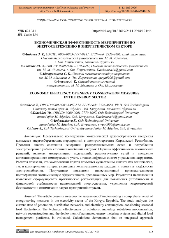 Представлено исследование экономической целесообразности внедрения комплекса энергосберегающих мероприятий в электроэнергетике Кыргызской Республики. Проведен анализ состояния генерации, распределительных сетей и потребления электроэнергии с учётом сезонных колебаний нагрузок. Оценена эффективность технических решений, включая модернизацию подстанций, реконструкцию сетей и внедрение автоматизированного коммерческого учёта, а также цифровых систем управления нагрузками. Расчеты показали, что комплексный подход позволяет существенно снизить как технические, так и коммерческие потери, уменьшить эксплуатационные расходы и повысить надёжность электроснабжения. Полученные показатели инвестиционной привлекательности подтверждают экономическую эффективность предложенных мер. Результаты исследования позволяют сформулировать практические рекомендации для повышения устойчивости и финансовой стабильности национальной энергосистемы, укрепления энергетической безопасности и оптимизации затрат предприятий отрасли.