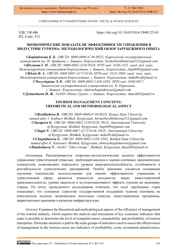 Рассматриваются теоретико-методологические аспекты эффективности управления туристической отраслью, требующей анализа и оценки ключевых экономических показателей, позволяющих определить уровень конкурентоспособности, устойчивости и рентабельности туристических предприятий. Особое внимание уделяется основными группами показателей, используемыми для оценки эффективности управления в туристической сфере, являются показатели доходности, затрат, инвестиционной привлекательности, уровня занятости и мультипликативного эффекта туризма на экономику страны. По итогу проведенного исследования отмечено, что опыт зарубежных стран показывает, что успешные стратегии государственной поддержки туризма основаны на комплексном подходе, включающем налоговые стимулы, инвестиционные программы, маркетинговые кампании и развитие инфраструктуры.