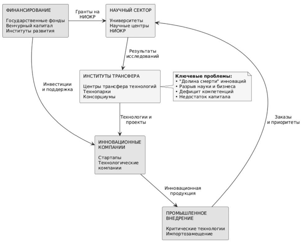 Особую проблему представляет недостаточное участие частного капитала в финансировании ранних стадий инновационных проектов. Венчурная индустрия, являющаяся в развитых экономиках ключевым источником финансирования технологических стар- тапов, в отечественных условиях характеризуется ограниченными масштабами и фокусом на проектах с коротким сроком возврата инвестиций. Институты развития, такие как Российская венчурная компания и ее дочерние фонды, не обеспечивают достаточного покрытия потребностей инновационных предприятий в рисковом капитале, особенно на стадии перехода от прототипа к промышленному производству. Данный разрыв, получивший в литературе название «долины смерти» инноваций, особенно критичен для проектов в области критических технологий, требующих создания дорогостоящих производственных мощностей и длительной сертификации [11].