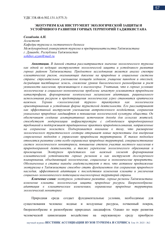 В данной статья рассматривается значение экологического туризма как одной из ведущих инструментов экологической защиты и устойчивого развития горных районов Таджикистана. Предметом исследования является анализ спектра климатических рисков, оказывающих давление на природные и социальные системы страны: стремительное уменьшение площади ледников, учащение паводков и оползней, деградация пастбищных земель, снижение уровня биологического разнообразия и рост уязвимости населения, проживающего в высокогорье. Учитывая, что в горных условиях экологические и социально-экономические проблемы зачастую усиливаются природными катастрофами, формирование комплексных механизмов адаптации, рационального использования ресурсов и предотвращения экологических угроз становится критически важным. Термин «экологический туризм» трактуется как экологически ориентированная и устойчивая форма туристской деятельности. Его рассматривают как эффективный инструмент уменьшения антропогенного воздействия, сохранения уникальных природных ландшафтов и повышения экологической культуры общества. Он обеспечивает создание альтернативных источников дохода для сельских жителей, способствует модернизации инфраструктуры с соблюдением природоохранных требований и поддерживает традиционные практики природопользования, направленные на сохранение экосистем. Подчеркивается внимание к тому, что расширение экологического туристического сектора открывает новые перспективы для внедрения современных подходов к управлению природными территориями. К таким подходам относятся развитие сети особо охраняемых природных территорий, совершенствование систем экологического мониторинга, повышение степени участия местного населения в природоохранной деятельности, а также укрепление экологического образования и просвещения. Экотуризм представлен как важный элемент формирования климатической устойчивости горных регионов и как инструмент долгосрочного планирования, объединяющий экологические, социальные и экономические приоритеты. Обозначенные в статье выводы свидетельствуют о том, что активное продвижение экотуризма в Таджикистане способно стать фундаментом для сохранения природного наследия, эффективной адаптации к последствиям изменения климата и увеличения социально-экономического потенциала высокогорных территорий страны.