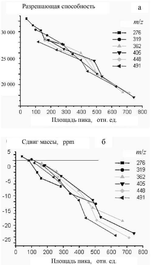 Следующий вопрос, который был разрешен экспериментально — являются ли кулоновские эффекты пороговыми. Для этого были проанализированы экспериментальные данные предыдущей серии, где спектры полимера PEI были записаны при различных временах инжекции. Для серии мажорных пиков построены зависимости разрешающей способности (рис. 10, а) и массового сдвига (рис. 10, б) от площади пика. Оба эффекта оказались линейно зависимыми от локальной ин-