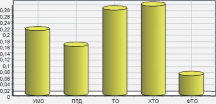 В качестве методов упрочнения рассматривались механическая обработка (УМО), поверхностное пластическое деформирование (ППД), термическая обработка (ТО), химико-термическая обработка (ХТО), физико-техническая обработка (ФТО). Анализ методов проводился применительно к серому чугуну. Как видно из рис. 1, величина коэффициента сравнения по принятой системе критериев для ХТО выше.