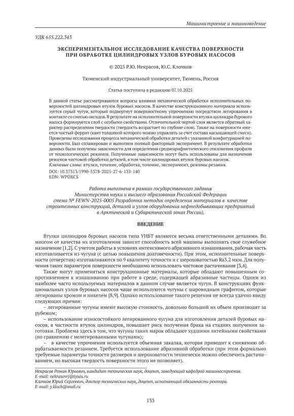 В данной статье рассматриваются вопросы влияния механической обработки исполнительных поверхностей цилиндровых втулок буровых насосов. В качестве конструкционного материала используется серый чугун, который подвергнут поверхностному упрочнению посредством легирования в контакте со смесью оксидов. В результате на исполнительной поверхности втулки цилиндра бурового насоса формируется слой с особыми свойствами. Отличительной чертой слоя является обратный характер распределения твердости (твердость возрастает по глубине слоя). Также на поверхности имеется чистый феррит (кант толщиной которого можно управлять за счет состава насыщающей смеси). Проведены исследования процесса механической обработки деталей с указанной конфигурацией поверхности. Был спланирован и выполнен полный факторный эксперимент. В результате обработки данных были получены зависимости для определения среднеарифметического отклонения профиля от технологических режимов. Полученные зависимости могут быть использованы для назначения режимов чистовой обработки деталей, в том числе цилиндровых втулок буровых насосов.