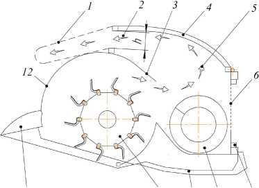 Р и с. 1. Схема экспериментальной очесывающей жатки с предварительным выделением мелкого вороха: