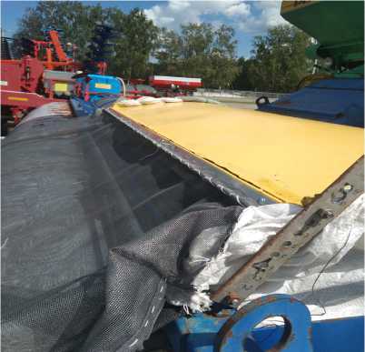 Для приема выделенного очесанного вороха изготовлена и смонтирована система его улавливания, состоящая из мягкого сетчатого контейнера (мешка), крепежной пластины и уголка. Сетчатый контейнер (мешок) изготовлен из прочного стекловолоконного материала. Величина отверстий в сетке порядка 1 мм, что исключало потерю как свободного зерна, так и других компонентов вороха. Боковины основного воздушного канала были закрыты плотной полипропиленовой тканью.
