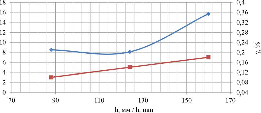 Графическая зависимость доли выделенных легких компонентов от высоты выходного канала при закрытых щитками сетчатых окнах представлена на рисунке 4. Здесь же нанесена кривая зависимости доли вынесенного зерна γ от высоты выходного канала h .