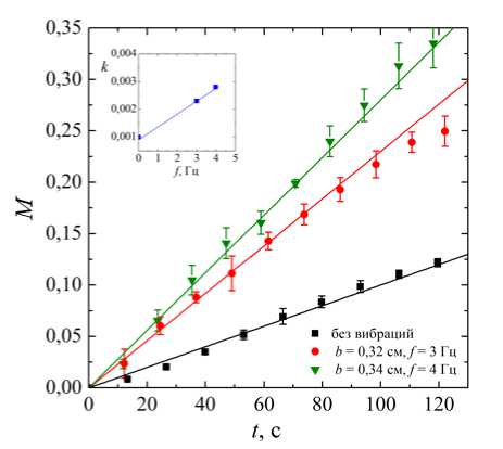 На рис. 5 представлены временные зависимости параметра смешения M , полученные при фиксированной частоте f = 3 Гц (рис. 5, а ) и близкой амплитуде b = 0,32-0,34 см (рис. 5, б). Хорошо видно, что включение поршневых колебаний значительно интенсифицирует процесс смешения по сравнению со случаем без колебаний. На начальном этапе все зависимости M ( t ) носят линейный характер, что позволяет охарактеризовать скорость массопереноса по углу наклона k = dM / dt аппроксимирующих прямых (сплошные линии на рис. 5). Полученные зависимости скорости массопере-носа k от амплитуды и частоты колебаний (см. вставки на рис. 5) монотонно возрастают, что указывает на включение дополнительных механизмов переноса, индуцируемых вибрациями. При этом влияние амплитуды выражено сильнее, о чем свидетельствует более крутой наклон зависимости k ( b ) по сравнению с k ( f ). Полученные результаты подтверждают, что взаимодействие осциллирующих потоков с молекулярной диффузией усиливает продольный перенос и разрушает стратификацию жидкости, ускоряя гомогенизацию системы. Это согласуется с гипотезой о включении вибрационно-индуцированного механизма, аналогичного дисперсии Тейлора.