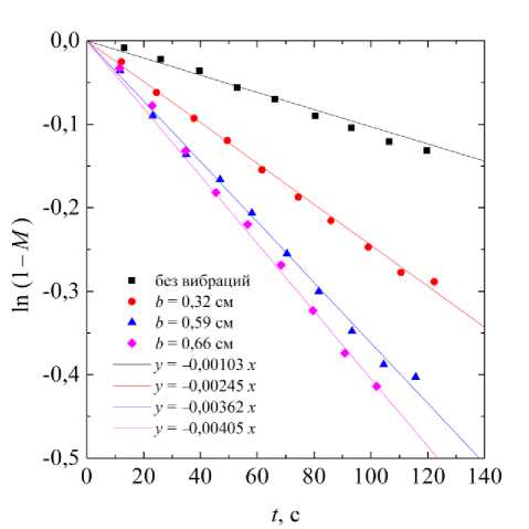 Полученные зависимости ln[1 - M ( t )] от времени t для различных амплитуд колебаний при фиксированной частоте f = 3 Гц представлены на рис. 6, а . Сплошные линии соответствуют линейным аппроксимациям вида ln(1– M ) = α· t . Хорошо видно, что аппроксимирующие прямые демонстрируют хорошее соответствие с экспериментальными данными, что подтверждает применимость выбранной экспоненциальной модели (2) для описания исследуемого процесса смешения.