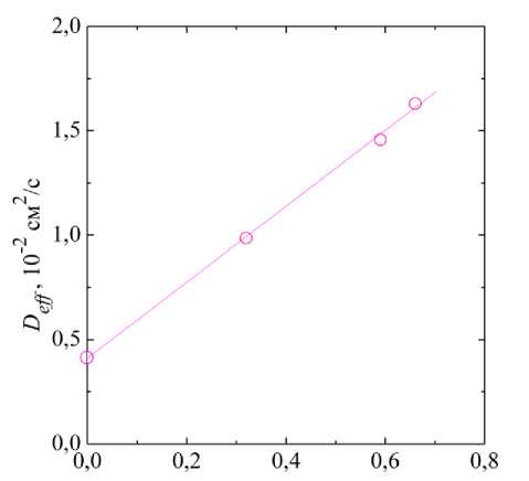 Для описания процессов переноса в исследуемой системе необходимо учитывать совокупное действие нескольких механизмов: молекулярной диффузии, конвекции двойной диффузии, а также вибрационно-индуцированных течений. Их взаимодействие приводит к ускоренному размытию начальной диффузионной зоны между исходными слоями и интенсивной гомогенизации жидкой системы, что можно интерпретировать как эффективный диффузионный перенос. В качестве дополнительной количественной характеристики процесса смешения рассчитан эффективный коэффициент диффузии Def, отражающий интегральную скорость перемешивания исходных растворов. Оценка Deff проводилась на основе аппроксимации экспериментальных зависимостей M(t) экспоненциальной моделью выравнивания концентрации: