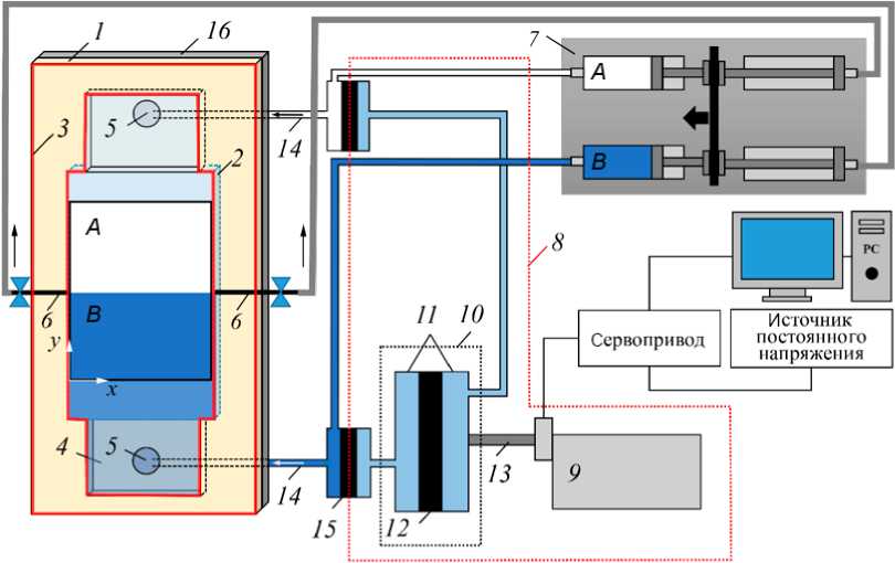Вертикальные колебания жидкой системы в неподвижной ячейке Хеле-Шоу создаются гидравлическим контуром 8 , который включает в себя линейный двигатель прямого привода 9 , соединенный с мембранным насосом тягово-натяжного типа 10 . Насос состоит из двух камер 11 , заполненных водой и разделенных гибкой резиновой мембраной 12 толщиной 0,1 см. Колебания штока 13 двигателя заданной частоты f и амплитуды передаются на мембрану 12 , создавая периодические перепады давления в гидравлическом контуре 8 . Через гибкие шланги 14 давление передается в расширительные объемы 5 ячейки, вызывая вертикальные колебания двуслойной жидкой системы вдоль внутренних стенок ячейки. Для предотвращения смешивания жидкостей в контуре и ячейке используются разделительные мембраны 15 .