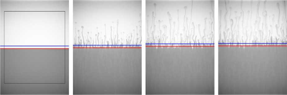 Рис. 2. Серия изображений, демонстрирующая эволюцию пальчиковой структуры конвекции двойной диффузии в условиях поршневых колебаний жидкости при частоте f = 3 Гц и амплитуде b = 0,32 Гц. Время с момента начала эксперимента t , c: 1, 59, 88, 117 (слева направо соответственно). Красной горизонтальной линией обозначено положение верхней границы диффузионной зоны x d . Синей линией обозначено горизонтальное сечение, вдоль которого извлекались профили яркости I ( x ), используемые для построения пространственно-временных карт. Ширина каждого изображения 6 см. Черной рамкой ограничена область, анализируемая при оценке степени взаимного смешения исходных слоев