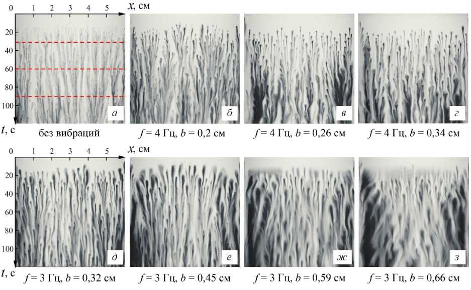 системы существенно изменяется. Рассмотрим серию пространственно-временных карт, полученную для частоты f = 3 Гц (см. рис. 3, д – з ). Установлено, что увеличение амплитуды колебаний приводит к тому, что пальчиковая структура становится более регулярной и приобретает более выраженную вертикальную ориентацию. Это объясняется увеличением доминирующего влияния инерционных сил, которые способствуют выравниванию концентрационных градиентов и подавлению случайных флуктуаций [13], что приводит к стабилизации и регуляризации пальчиковой структуры. Кроме того, с ростом амплитуды наблюдается уменьшение пространственной устойчивости пальцев: как первичные, так и вторичные структуры становятся размытыми. Этот эффект обусловлен дисперсией Тейлора [37] – явлением, при котором осциллирующие сдвиговые потоки, взаимодействуя с молекулярной диффузией, приводят к эффективному увеличению продольного переноса вещества, ускоренному диффузионному размытию структур и интенсификации процесса коалесценции пальцев.