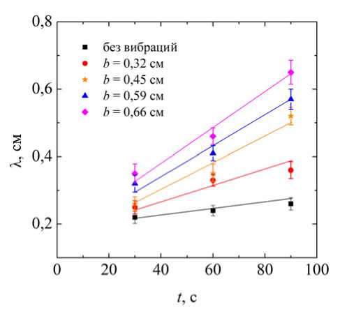 Все зависимости Х( t ) описываются линейным законом Х( t )=Zo + S г t . Полученные угловые коэффициенты S x показывают, что скорость увеличения длины волны монотонно возрастает с увеличением амплитуды вибраций: от 9-10-4 (без вибраций) до 540-3 см/с (при b = 0,66 см).