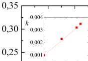 б - близкой амплитуде поршневых колебаний. Сплошные линии соответствуют линейной аппроксимации экспериментальных данных. На вставках представлены зависимости угла наклона k = dM / dt аппроксимирующих прямых от параметров поршневых колебаний