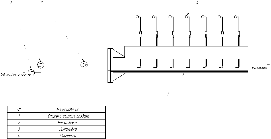 1 – ступень сжатия воздуха; 2 – расходомер; 3 – экспериментальная установка; 4 – манометр