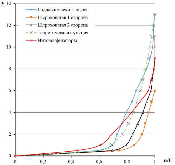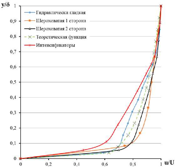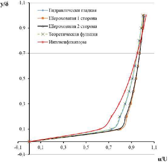 Для участка № 6 представлена графическая зависимость для эпюр распределения скорости в безразмерных y /δ- u / U координатах для гидравлически гладкой пластины, шероховатой пластины (1 сторона), шероховатой пластины (2 сторона) и пластины с интенсификаторами. Итоговые аппроксимирующие функции для участка № 6 представлены графически на рис. 16.