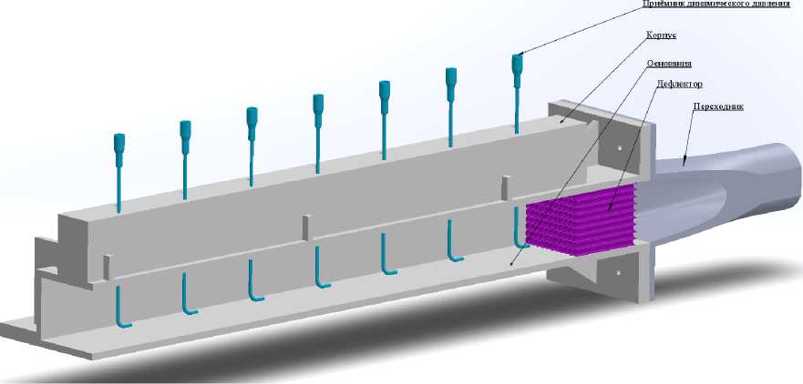 Экспериментальная установка (рис. 3–4) представляет собой прямоугольный канал сечением 36×52 мм и длиной 372 мм, изготовленный из акрилового оргстекла. В корпусе установки размещены 7 приемников статического давления и 7 приемников полного давления (иглы диаметром 2 мм с отверстием 1,2 мм), расположенные с шагом 50 мм вдоль оси канала. Приемники статического давления устанавливаются в специально подобранных контрольных сечениях проточной части, где поток обладает установившимся характером и отсутствуют значительные градиенты давления. Монтаж осуществляется через предварительно выполненные отверстия в стенках каналов, которые загерметизированы для исключения утечек. Оси датчиков строго перпендикулярны направлению потока, чтобы минимизировать влияние динамического напора. Приемники полного давления загнуты под углом 90° для ориентации навстречу потоку. Для выравнивания и стабилизации потока установлен дефлектор и переходник, изготовленые по технологии FFF.