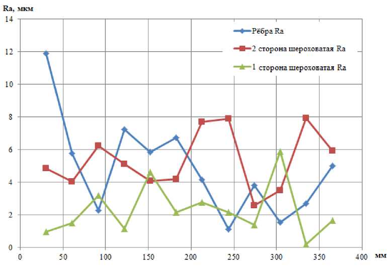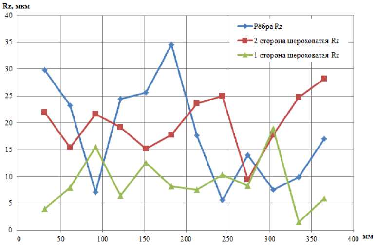 Контроль шероховатости поверхности пластин проводился профилометром TR 110. Измерения параметров Ra и Rz проводились в поперечном направлении с шагом 30,4 мм по всей длине пластины. Результаты измерений представлены в табл. 1 и на рис. 8–13, а усредненные значения – в табл. 2.