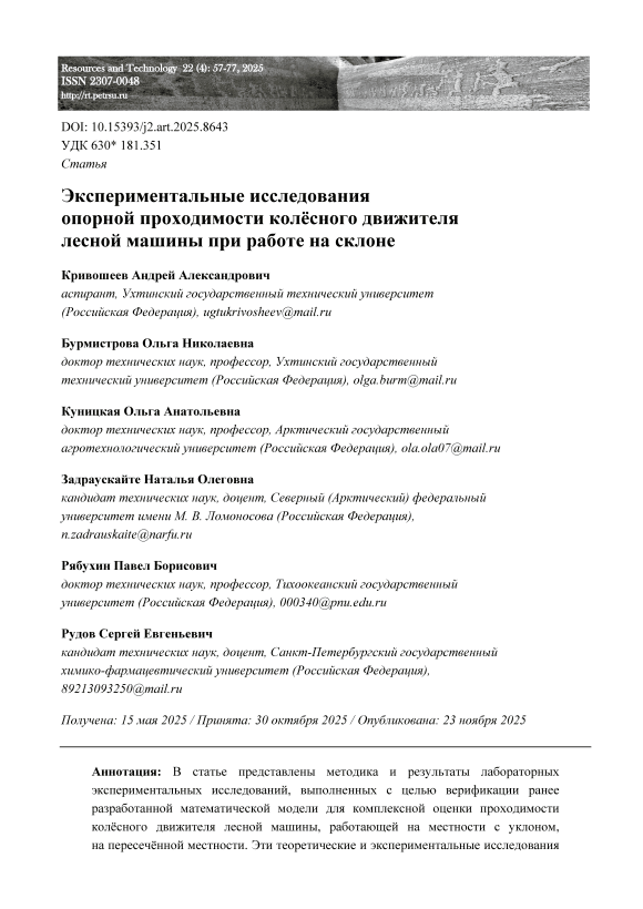 В статье представлены методика и результаты лабораторных экспериментальных исследований, выполненных с целью верификации ранее разработанной математической модели для комплексной оценки проходимости колёсного движителя лесной машины, работающей на местности с уклоном, на пересечённой местности. Эти теоретические и экспериментальные исследования направлены на изучение эксплуатационной и экологической эффективности валочно-трелёвочно-процессорных машин австрийской семейной компании Konrad Forsttechnik GmbH. В результате выполненных экспериментальных исследований определены допустимое давление движителя, а также несущая способность почвогрунта с учётом угла склона и выполнено сопоставление ранее полученных теоретических оценок. Установлено отклонение теоретических оценок от результатов экспериментов в меньшую сторону, допустимое с учётом статистической оценки распределения ошибок и погрешностей измерения. Показано, что уточнение расчётных моделей позволит развить положения теории движения лесных машин в условиях пересечённой местности, что особенно актуально в контексте дальнейших разработок по обоснованию параметров техники для условий пересечённой местности.