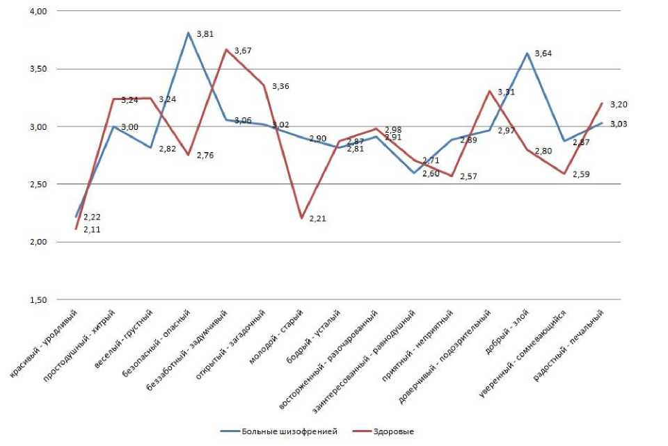 Рис. Среднегрупповые семантические профили больных шизофренией и здоровых испытуемых Fig. Mean semantic profiles for the schizophrenia patient and healthy control groups