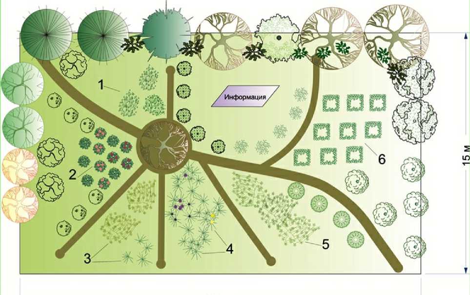 Внутри экспозиции травянисты растения, лианы, кустарники и полукустарнички предполагается группировать по экологическому и систематическому принципу (по требованию к субстрату, увлажнению и освещению). Экологический принцип за годы интродукионной работы на территории Ботанического сада показал наибольшую эффективность, он позволяет облегчить уходные работы и обеспечить оптимальные условия выращивания. Данные группы растений обозначены на плане цифрами 1-6 (рис. 1). Травянистые многолетники в таких группах могут занимать 1-2 м2, полукустарнички – 3-4 экз. Внутри группы предполагаются этикетки. Режим полива отличается в каждой группе, что требует соответствующего технического оснащения.