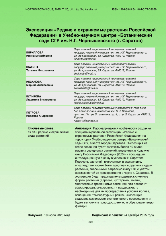 Рассматриваются особенности создания специализированной экспозиции «Редкие и охраняемые растения Российской Федерации» на территории Учебно-научного центра «Ботанический сад» СГУ, в черте города Саратова. Экспозиция на этапе создания будет включать более 40 видов высших сосудистых растений, внесенных в Красную книгу Российской Федерации (2024) и прошедших интродукционную оценку в условиях г. Саратова. Перечень растений, включенных в экспозицию, впоследствии может быть дополнен и другими видами растений, внесёнными в Красную книгу РФ, с учетом возможностей их произрастания в черте г. Саратова. В экспозиции будут представлены разные жизненные формы растений (деревья, кустарники, лианы, многолетние травянистые растения), что позволит сформировать микроклимат и поддерживать необходимые для их произрастания условия полива, освещения, температурный режим. Экспозиция задумана как элемент экологического просвещения и будет выполнять природоохранную и образовательную функции.