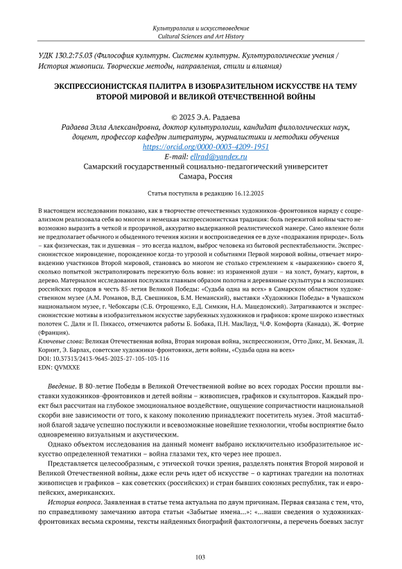 В настоящем исследовании показано, как в творчестве отечественных художниковфронтовиков наряду с соцреализмом реализовала себя во многом и немецкая экспрессионистская традиция: боль пережитой войны часто невозможно выразить в четкой и прозрачной, аккуратно выдержанной реалистической манере. Само явление боли не предполагает обычного и обыденного течения жизни и воспроизведения ее в духе «подражания природе». Боль – как физическая, так и душевная – это всегда надлом, выброс человека из бытовой респектабельности. Экспрессионистское мировидение, порожденное когдато угрозой и событиями Первой мировой войны, отвечает мировидению участников Второй мировой, становясь во многом не столько стремлением к «выражению» своего Я, сколько попыткой экстраполировать пережитую боль вовне: из израненной души – на холст, бумагу, картон, в дерево. Материалом исследования послужили главным образом полотна и деревянные скульптуры в экспозициях российских городов в честь 85летия Великой Победы: «Судьба одна на всех» в Самарском областном художественном музее (А.М. Романов, В.Д. Свешников, Б.М. Неманский), выставки «Художники Победы» в Чувашском национальном музее, г. Чебоксары (С.Б. Отрощенко, Е.Д. Симкин, Н.А. Мацедонский). Затрагиваются и экспрессионистские мотивы в изобразительном искусстве зарубежных художников и графиков: кроме широко известных полотен С. Дали и П. Пикассо, отмечаются работы Б. Бобака, П.Н. МакЛауд, Ч.Ф. Комфорта (Канада), Ж. Фотрие (Франция).