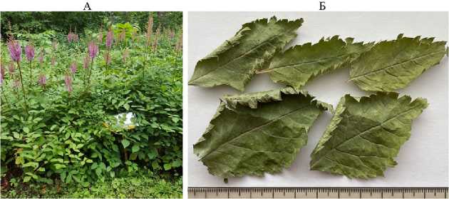 Рис. 1. Растения Astilbe rubra Hook. f. & Thomson во время цветения в Ботаническом саду лекарственных растений ФГБНУ ВИЛАР (А) и лиофильно высушенные листья (Б) (г. Москва, 2023 год) .