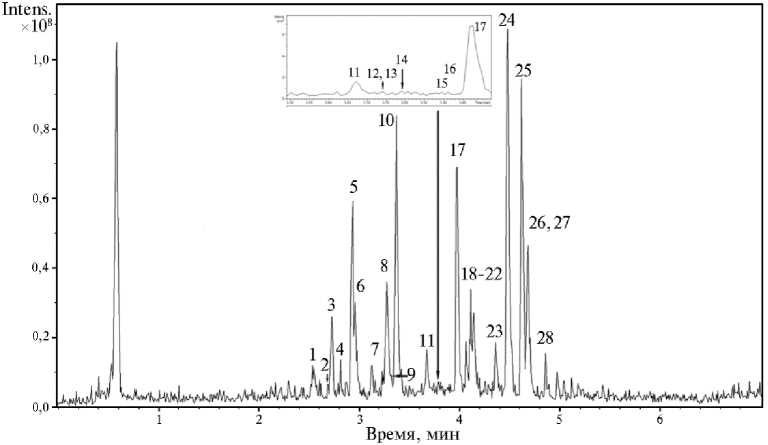 Результаты. В результате проведенного анализа в экстракте из листьев A. rubra (рис. 1) было обнаружено 28 соединений (фенольные кислоты, проантоцианидины и флавоноиды) (табл., рис. 2).