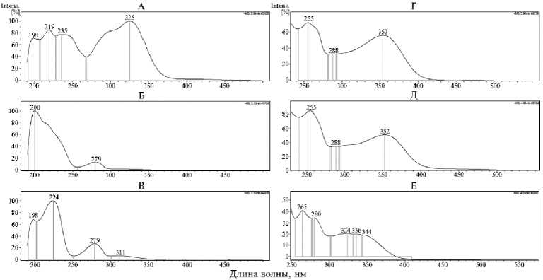 Рис. 3. Примеры УФ-спектров соединений ацетонового экстракта из листьев Astilbe rubra Hook. f. & Thomson: А — кофеоилхинная кислота, изомер 1; Б — тример процианидина В-типа, изомер 1; В — эпикатехин; Г — рутин, изомер 1; Д — кверцетин-малонил-арабинофуранозид, изомер 1; Е — кемпферол-рамнофуранозид, изомер 1 (Ботанический сад лекарственных растений ФГБНУ ВИЛАР, г. Москва, 2023 год).
