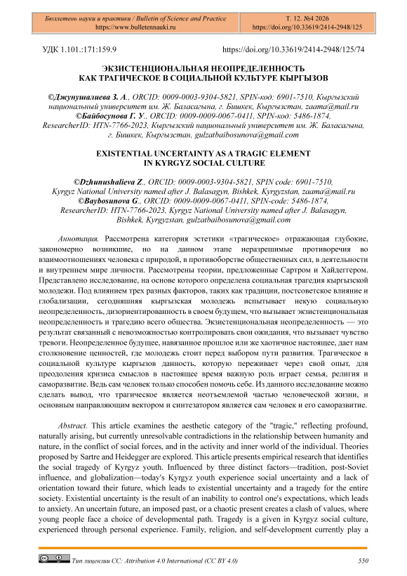 Рассмотрена категория эстетики «трагическое» отражающая глубокие, закономерно возникшие, но на данном этапе неразрешимые противоречия во взаимоотношениях человека с природой, в противоборстве общественных сил, в деятельности и внутреннем мире личности. Рассмотрены теории, предложенные Сартром и Хайдеггером. Представлено исследование, на основе которого определена социальная трагедия кыргызской молодежи. Под влиянием трех разных факторов, таких как традиции, постсоветское влияние и глобализации, сегодняшняя кыргызская молодежь испытывает некую социальную неопределенность, дизориентированность в своем будущем, что вызывает экзистенциональная неопределенность и трагедию всего общества. Экзистенциональная неопределенность — это результат связанный с невозможностью контролировать свои ожидания, что вызывает чувство тревоги. Неопределенное будущее, навязанное прошлое или же хаотичное настоящее, дает нам столкновение ценностей, где молодежь стоит перед выбором пути развития. Трагическое в социальной культуре кыргызов данность, которую переживает через свой опыт, для преодоления кризиса смыслов в настоящее время важную роль играет семья, религия и саморазвитие. Ведь сам человек только способен помочь себе. Из данного исследование можно сделать вывод, что трагическое является неотъемлемой частью человеческой жизни, и основным направляющим вектором и синтезатором является сам человек и его саморазвитие.