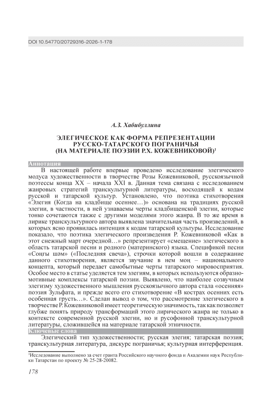 Элегическое как форма репрезентации русско-татарского пограничья (на материале поэзии Р.Х. Кожевниковой)