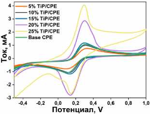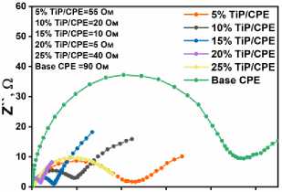 Для оптимизации количества модификатора в угольной пасте мы использовали дополнительные измерения ЭИС в паре [Fe(CN) 6 ]3–/4– для УПЭ с различным содержанием TiP 1/6: 5, 10, 15, 20 и 25 %. Из результатов, представленных на рис. 4а–в, электрод УПЭ с 20 % TiP 1/6 показал наименьшее значение R ct = 5 Ом, что означает, что это количество является наиболее подходящим для приготовления УПЭ модифицированного TiP 1/6.