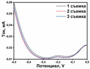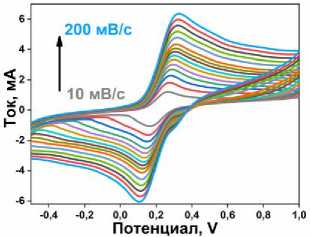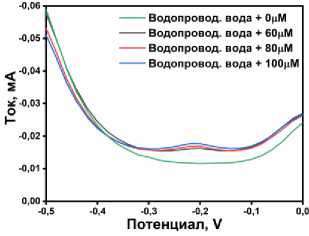 Электрохимические исследования проводились на бипотенциостате CH Instruments (CHIn-strumetns, Остин, Техас, США), модель 760 b. Программное обеспечение для вольтамперометрии CHI (версия 2.03, CHInstrumetns). Использовалась трехэлектродная ячейка (общий объем 10 мл), где в качестве рабочего электрода использовался немодифицированный или модифицированный УПЭ, Ag/AgCl в качестве электрода сравнения и платиновая проволока в качестве вспомогательного электрода. Для характеристики электрода в качестве тестового раствора использовалась 5 ммоль/л смесь K 3 [Fe(CN) 6 ]/K 4 [Fe(CN) 6 ] (1:1) в 0,1 М KCl. В качестве фонового раствора использовался универсальный буферный раствор Бриттона-Робинсона (БР). Электрохимическая импедансная спектроскопия (ЭИС) регистрировалась в диапазоне частот от 10 мГц до 10 кГц. Циклическая вольтамперометрия (ЦВА) регистрировалась в диапазоне потенциалов от -0,5 В до 1,0 В со скоростью развертки 50 мВ/с. Для разработки аналитических процедур использовалась квадратно-волновая вольтамперометрия [31].
