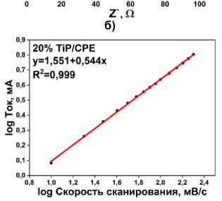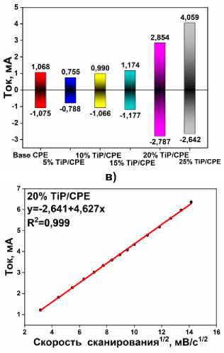 Рис. 4. а) ЦВА-кривые в окислительно-восстановительной паре Fe 2+/3+ для УПЭ с различным содержанием TiP 1/6: 5, 10, 15, 20 и 25 %; б) спектры ЭИС для УПЭ с различным содержания TiP 1/6 (5, 7, 10 и 15 %); в) токи окисления-восстановления для УПЭ с различным содержания TiP 1/6; г) ЦВА в окислительно-восстановительной паре Fe 2+/3+ для УПЭ с 20 % TiP 1/6 при различных скоростях сканирования (10–200 мВ/с); д) зависимость log(I a ) от log(v) для УПЭ с 20 % TiP 1/6; е) зависимость от I a для УПЭ с 20 % TiP 1/6 от v 1/2