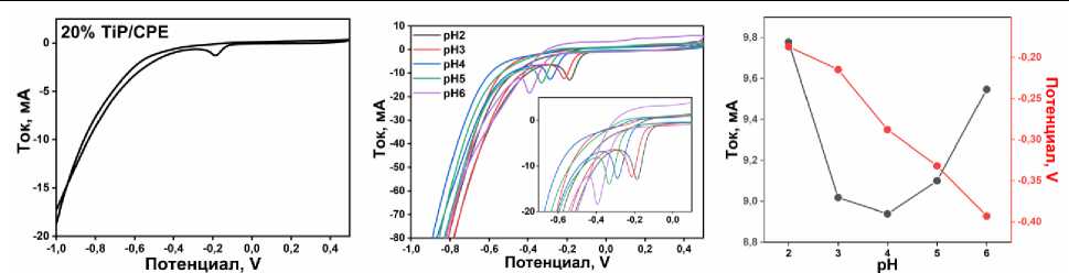 Для оценки электроаналитических свойств синтезированных материалов проведено исследование их активности в отношении восстановления ФТД методом циклической вольтамперометрии. На рис. 5а представлены вольтамперограммы электродов 20 % TiP/УПЭ в 1 ммоль/л растворе ФТД (БР, pH = 2) при скорости сканирования 50 мВ/с и 20 % содержания катализатора. Электрод демонстрируют четко выраженный пик восстановления при –0,2 В, отсутствующий при обратном сканировании, что свидетельствует о необратимом характере электрохимического процесса.