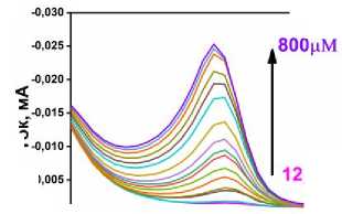 Последовательно были оптимизированы амплитуда импульса (в диапазоне от 10 до 100 мВ), частота (в диапазоне от 10 до 100 Гц) и приращение потенциала (в диапазоне от 2 до 16 мВ). Во время оптимизации одного параметра другие оставались постоянными. В результате, мы получили следующие оптимальные значения: амплитуда импульса – 10 мВ, приращение импульса – 10 мВ и частота – 10 Гц, которые были использованы для разработки электроаналитического метода.