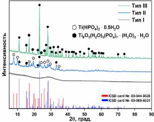 EDS-анализ образца тип II подтверждает равномерное распределение элементов Ti, P и O (рис. 1а). Рентгенофазовый анализ (рис. 1б) выявил эволюцию состава от аморфного TiP (4 ч) через двухфазную систему Ti(HPO 4 ) 2 ·0.5H 2 O/Ti 6 O 3 (H 2 O) 3 (PO 4 ) 7 ·(H 3 O) 3 ·H 2 O (12 ч) до монокристаллической фазы Ti 6 O 3 (H 2 O) 3 (PO 4 ) 7 ·(H 3 O) 3 ·H 2 O (≥ 48 ч) (рис. 1а) [15–17]. Очевидно также нарастание степени кристалличности фосфата титана при более длительном времени гидротермального синтеза.