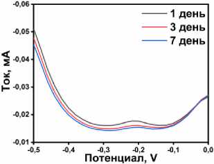 Проверка воспроизводимости для трех последовательных измерений для концентрации 60 мкМ показала стандартное отклонение (СО) = 7,7 % (рис. 7а), а исследования стабильности в течение недели (1 день, 3 день и 7 день) для 60 мкМ раствора подтвердили сохранение отклика электрода (СО = 10,1 %) (рис. 7б). Полученные результаты свидетельствуют о надежности разработанного метода для количественного определения ФТД, что обусловлено оптимальной структурой материала и его электрокаталитическими свойствами.