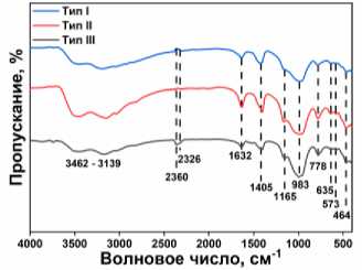 Анализируя ИК-спектры на рис. 1в, можно сказать следующее: наличие широкой полосы поглощения в районе 3462–3139 см–1 указывает на валентные колебания связей O-H в гидроксильных группах (-Ti-OH, -P-OH) и/или молекулах адсорбированной воды [18–20]. Различия в форме и интенсивности этой полосы между типами говорят о разной степени гидратации или количестве поверхностных OH-групп. Полосы при ~1165 см–1 (валентные колебания P-O в P-O-P или связи P=O) и особенно интенсивный пик при ~983 см–1 (характерное валентное колебание связи P=O в фосфатных группах) однозначно подтверждают доминирующее присутствие фосфатных анионов (PO43– или их конденсированных форм). Полосы в области 635–464 см–1 (валентные колебания Ti-O-Ti в оксидной сетке TiO 6 и/или Ti-O-P связей, а также деформационные колебания O-P-O) характерны для структур, содержащих титан-кислородные октаэдры, связанные с фосфатными тетраэдрами [21–23].