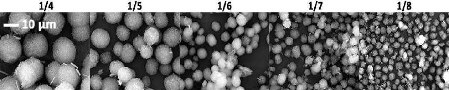 Исследования показали выраженную зависимость размера микросферических частиц от концентрации фосфорной кислоты (ФК) (рис. 2а, б). При изменении начального соотношения Ti:P от 1/8 до 1/4 наблюдалось значительное увеличение их среднего размера с ~3–4 мкм до ~15 мкм (рис. 2б). Данный эффект объясняется тем, что более высокие концентрации ФК приводят к увеличению числа центров кристаллизации, что способствует образованию более мелких микросфер. С другой стороны, высокие концентрации фосфат-анионов препятствуют механизму пере-растворения-осаждения, блокируя рост микросфер по механизму Оствальдовского созревания.