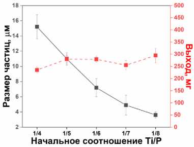 Рис. 2. а) СЭМ-микрофотографии образцов TiP, синтезированных при различных начальных соотношениях Ti:P, б) соответствующий средний размер и выход TiP образцов (24 ч, 140 °C)