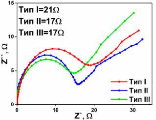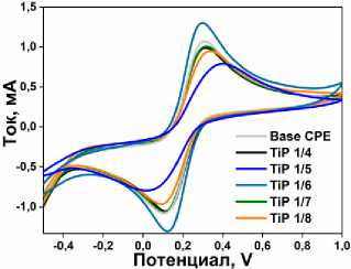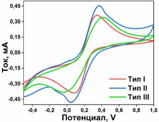 Рис. 3. а) ЦВА окислительно-восстановительной пары Fe 2+/3+ для УПЭ модифицированных TiP образцами с морфологиями типов I–III; б) ЭИС для УПЭ модифицированных TiP образцами с морфологиями типов I–III; в) ЦВА окислительно-восстановительной пары Fe 2+/3+ + для УПЭ модифицированных TiP 1/8–1/4;