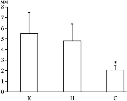 Рис. 1. Изменение СОЭ крови человека после дистанционного влияния на кровь субъективного состояния испытателя: К – контрольный тест, Н – нейтральный, С – субъективный (*p ≤ 0,05 по сравнению с контрольным и субъективным тестом) [33] Fig. 1. Change in human blood ESR following remote influence on the blood by the experimenter’s subjective state: К – control test, Н – neutral, С – subjective (*p≤0.05 compared to the control and subjective test) [33]