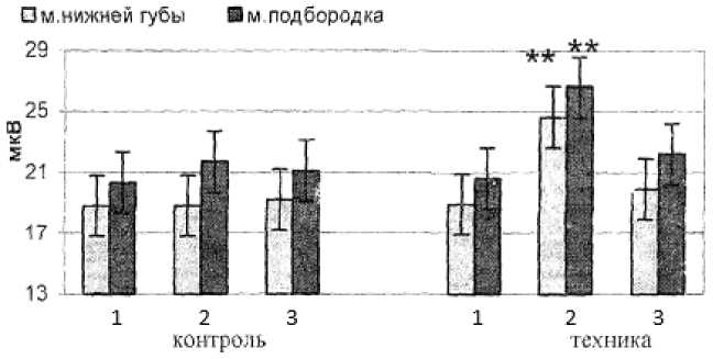 Note: м. – muscles, «техника» – non-verbal influence; 1 – baseline, 2 – time of influence, 3 – end of influence; ** – significance of differences during non-verbal influence compared to baseline at р < 0.01