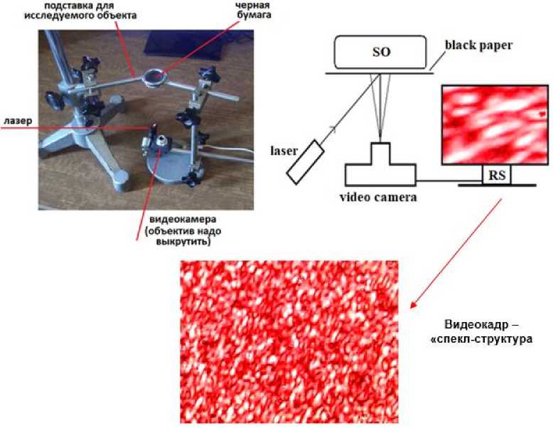 Рис. 4. Схема прибора «Спеклоскоп»: SO – изучаемый объект, RS – система регистрации и пример кадра видеофрагмента – «спекл-структура»